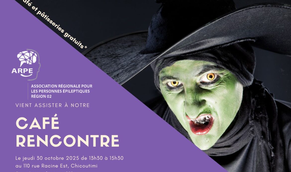 L’Association Régionale pour les Personnes Épileptiques (Région 02) est heureuse de vous inviter à son café-rencontre spécial Halloween qui se déroulera le jeudi 31 octobre prochain de 13h30 à 15h30 à nos bureaux au 110 rue Racine Est, Chicoutimi, 2e étage, bureau 218. Profitez de ce moment pour créer de nouveaux liens et partager vos actualités du jour. Du café et des pâtisseries vous seront